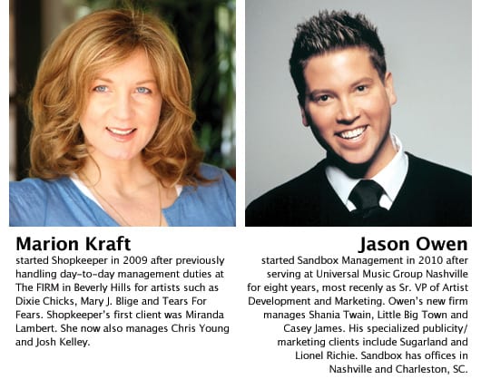 To get some firsthand perspective MusicRow spoke with the heads of two fast developing new management companies, Marion Kraft Owner of Shopkeeper Management and Jason Owen, Owner of Sandbox Entertainment. The two have many things in common: they each worked for larger firms before deciding to form their own company, they are both recent additions to the CMA Board of Directors and they both quickly built rosters with high profile, successful clients. Their comments below prove they have another trait in common, they are fiercely loyal and protective of their artists.
