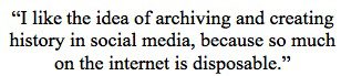I like the idea of archiving and creating history in social media, because so much on the internet is disposable.