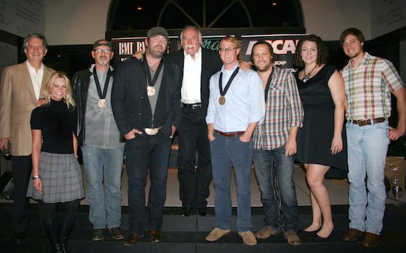 (back row, l-r): Curb Records’ Mike Curb; Curb Music’s Drew Alexander; producer Matt McClure; and ASCAP’s Ryan Beuschel (middle row, l-r): Lee Brice; co-writers Billy Montana, John Ozier, and Ben Glover; and Ariose Music Group’s Jeremy Ash; (front row, l-r): BMI’s Bradley Collins; producer Kyle Jacobs; and Ariose Music Group’s Eddie DeGarmo. Photo: Erika Goldring