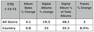 The start of the year is traditionally slow for music sales since fans are are facing the reality of paying down holiday credit card bills. Still, there were non-country debuts from Chris Tomlin (No. 1; 73k) and Undead Hollywood (No. 2; 53k) that topped the all genre list and kept overall album sales in positive Y/Y territory (+4.1%).