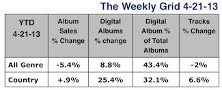 All genre track sales are down 2% YTD, but country track sales are up 7%.