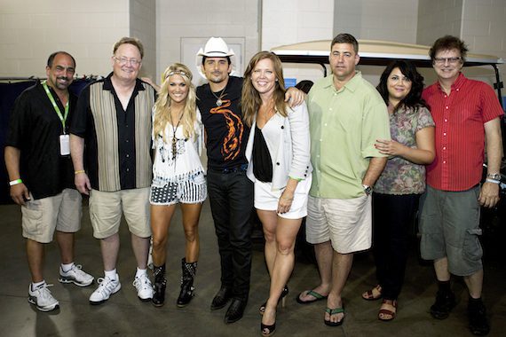 Before performing their hit song “Remind Me” onstage at LP Field on Sunday evening (June 9), Brad Paisley and Carrie Underwood joined members of their label teams for a photo op.