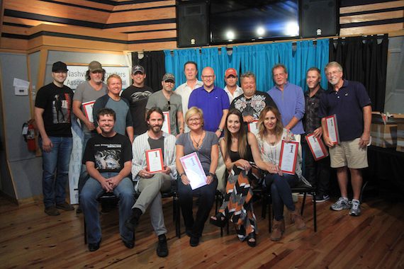 Pictured (Front row, L-R): NSAI President Lee Thomas Miller, Paul Jenkins, Connie Harrington, Natalie Hemby, Jessi Alexander. (Second row, standing, L-R): Luke Laird, David Lee Murphy, Shane McAnally, Jimmy Yeary, Andrew Dorff, NSAI Executive Director Bart Herbison, Mark Bright, Tim James, Craig Wiseman, President’s Choice Award recipient Gerry House, Jason Sellers, Tom Shapiro