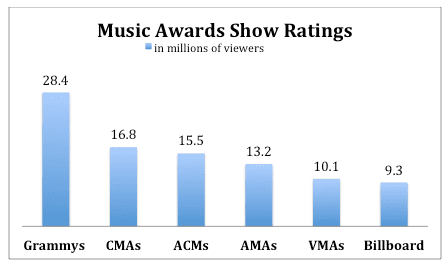 The Oscars on ABC are the top show with 40.4 million viewers. The Grammys on CBS are the most watched music show, and second overall, with 28.4 million.