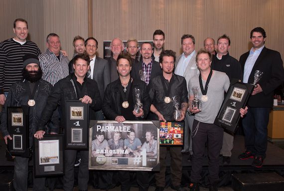 BMI celebrated the team behind North Carolina band Parmalee’s two-week No. 1 hit “Carolina” Tuesday (Feb. 11) at the company’s offices in Nashville. Written by Richard Beato and Parmalee’s Scott Thomas, Matt Thomas, Josh McSwain and Barry Knox, the song earned all five writers their first No. 1 song. It has been a long journey for the band, but a fulfilling one. In February 2011, the band performed a final showcase for Stoney Creek Records, after enduring a near-fatal robbery attempt that severely injured Scott Thomas. “The label waited for Scott to heal, and we came down to do another full showcase [before signing Parmalee to a deal]. We are definitely a family band, and so we found the perfect family for us,” said his brother and bandmate Matt.