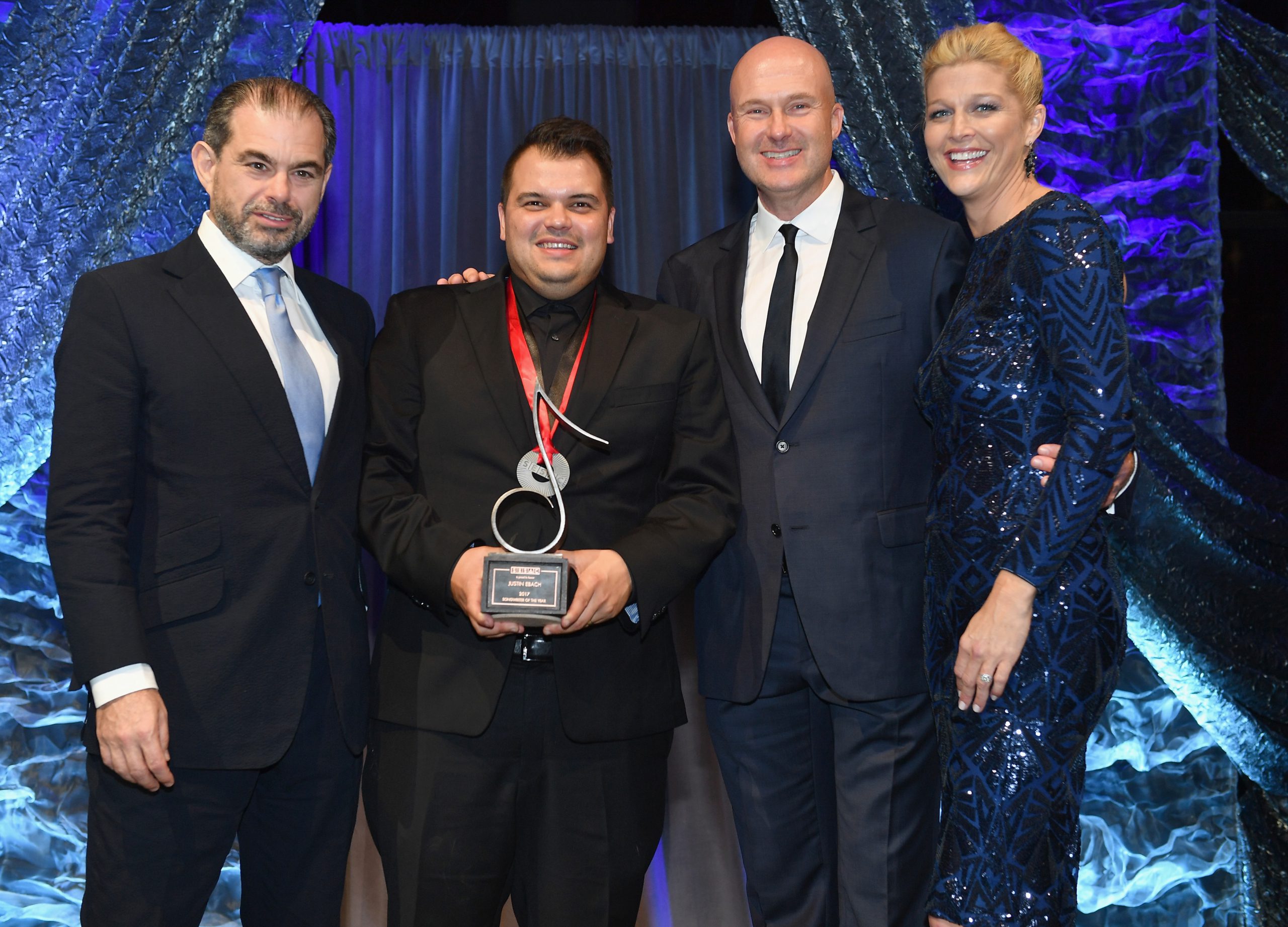 Chairman and CEO of SESAC John Josephson, SESAC Songwriter of the Year Justin Ebach, Senior Vice President of Creative Operations for SESAC Sam Kling, and Vice President of Creative Services for SESAC Shannan Hatch pose for a photo onstage during the 2017 SESAC Nashville Music Awards on November 5, 2017 in Nashville, Tennessee. Photo: Jason Davis/Getty Images for SESAC