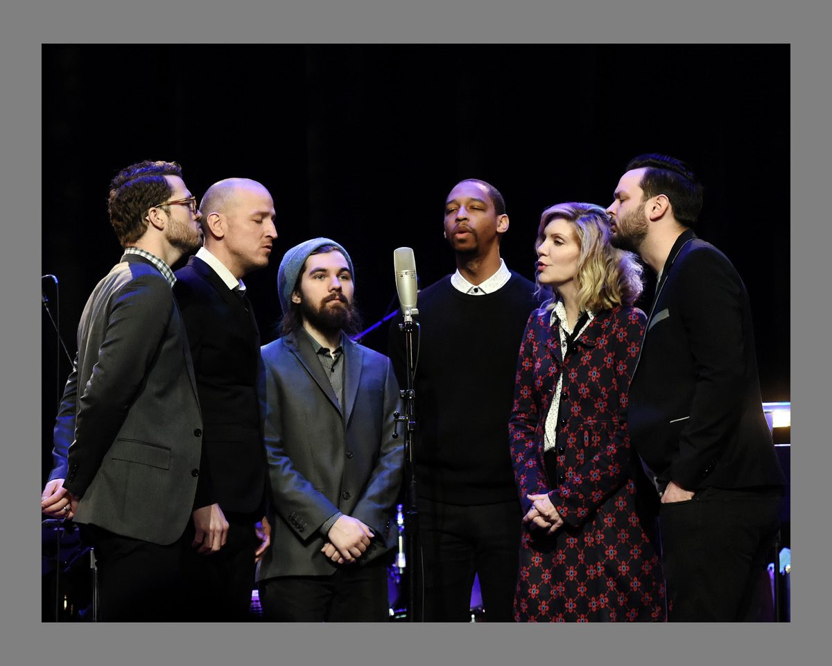 Street Corner Symphony (L-R: Kaleb Jones, Jeremy Lister, Kurt Zimmerman, Armand Hutton and Jonathan Lister) join Alison Krauss. Photo by Rick Diamond/Getty Images