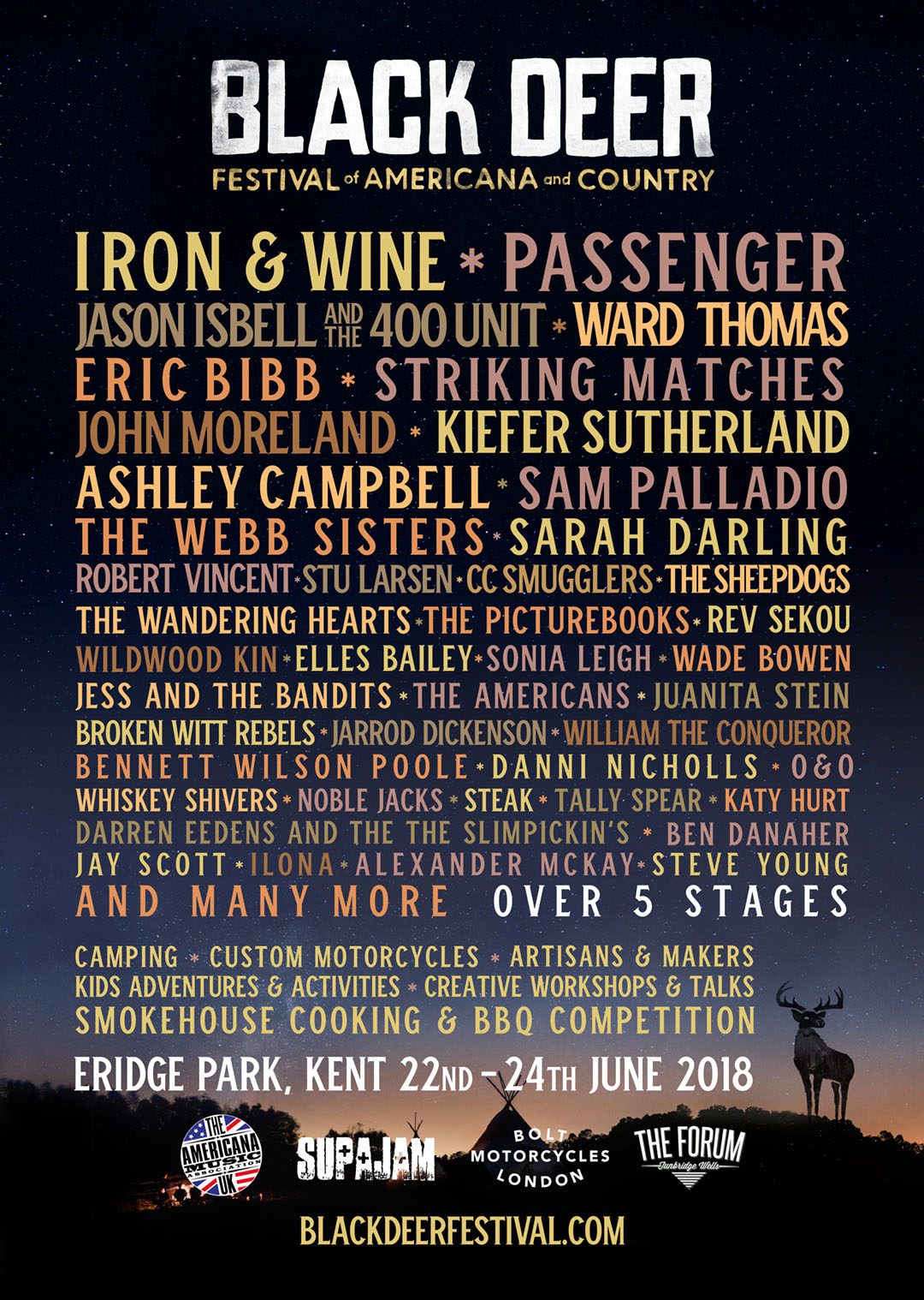 Previously announced artists set to perform at Black Deer include Iron & Wine, Passenger, Jason Isbell & the 400 Unit (UK Festival Exclusive), Ward Thomas, Eric Bibb, Striking Matches, John Moreland, Kiefer Sutherland, Ashley Campbell, Sam Palladio, The Webb Sisters, Stu Larsen, CC Smugglers, The Sheepdogs, The Wandering Hearts, The Picturebooks, Rev Sekou, Wildwood Kin, Elles Bailey, Sonia Leigh, Wade Bowen, The Americans, Juanita Stein, Broken Witt Rebels, Jarrod Dickenson, William the Conqueror, Bennett Wilson Poole, Danni Nicholls, Whiskey Shivers, Darren Eedens and the Slim Pickin’s, Ben Danaher, Alexander McKay. and Steve Young.
