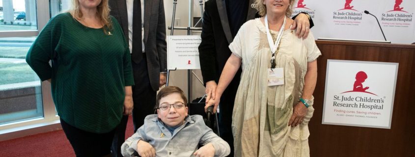 Randy Owen, his wife Kelly, ALSAC CEO Richard Shadyac, Jr., St. Jude patient Caleb and his mother Kelly stand by a plaque honoring Owen for his dedication to the life-saving mission of St. Jude Children’s Research Hospital during a press conference at the Country Cares seminar