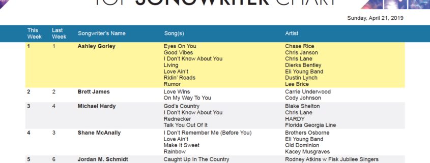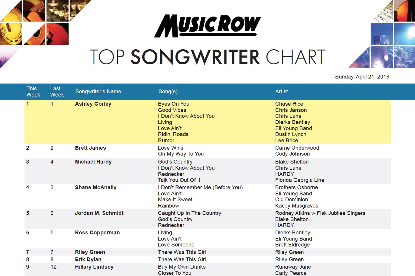 MusicRow Top Songwriter Chart: Ashley Gorley, Brett James, Michael Hardy