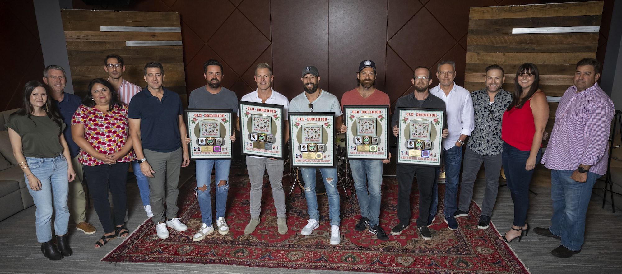 (L-R): Taylor Lindsey, VP A&R SMN; Dennis Reese, SVP Promotion RCA Records Nashville; Caryl Atwood, SVP Sales/Streaming SMN; Will Hitchcock, Manager Morris Higham Management; Ken Robold, COO/EVP SMN; Old Dominion’s Brad Tursi, Trevor Rosen, Matthew Ramsey, Geoff Sprung, and Whitt Sellers; Randy Goodman, Chairman/CEO SMN; Clint Higham, President Morris Higham Management; Paige Altone, Sr. Director Marketing SMN; and Jim Catino EVP A&R SMN. Photo Credit: Alan Poizner
