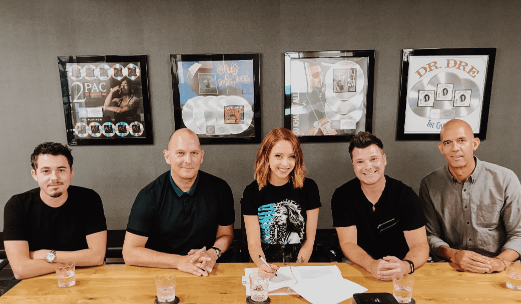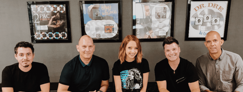 Pictured (L-R): Jamie Starling, eOne Business Affairs; Chris Taylor, eOne Global President Music; Kalie Shorr; Aaron Pearce, Vintern Songs CEO; Todd Roberts, eOne VP of A&R Music Publishing