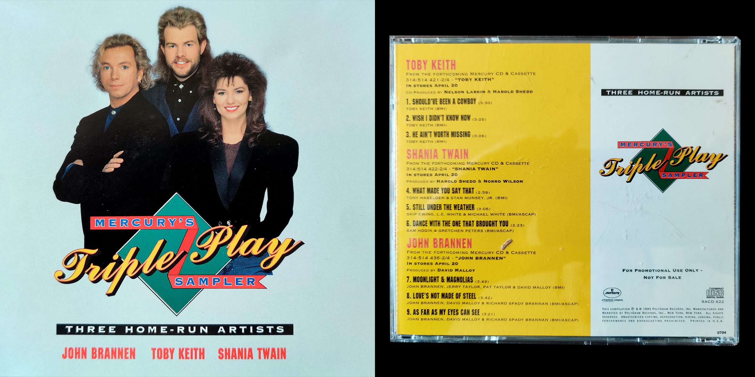 Mercury’s Triple Play Sampler: Three Home-Run Artists was released in 1993, featuring John Brannen, Toby Keith and Shania Twain.