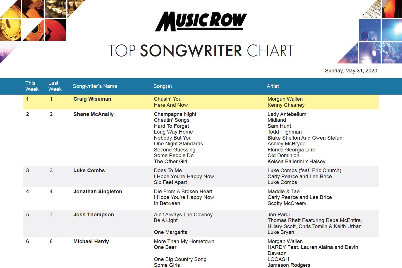 Craig Wiseman remains at No. 1, and Shane McAnally (No. 2), Luke Combs (No. 3) and Jonathan Singleton (No. 4) follow behind.