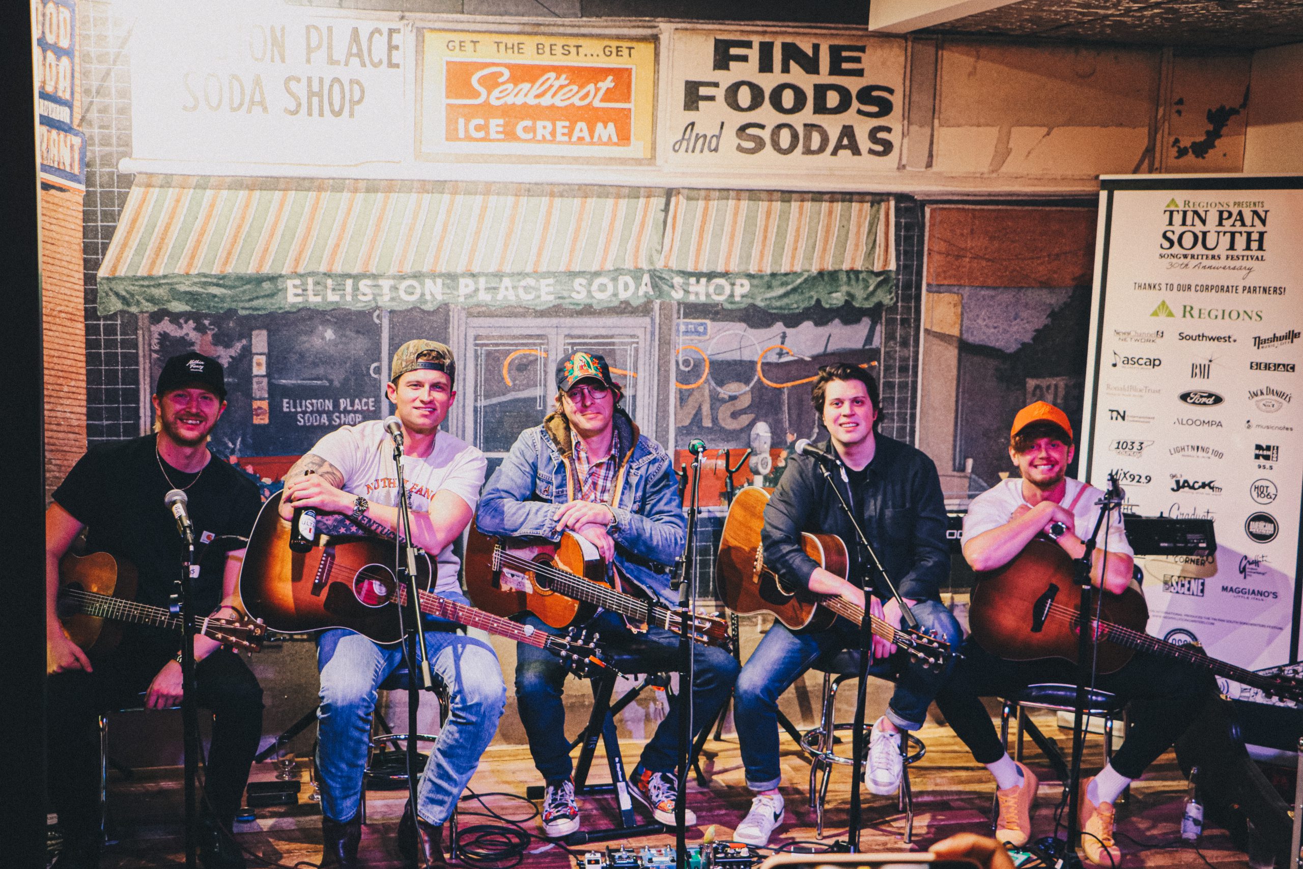 Pictured (L-R): Dalton Stanley, Sean Stemaly, Stephen Wilson Jr., Matt Roy, and Jordan Harvey at Elliston Place Soda Shop. Photo: Tin Pan South/Brittni Talley