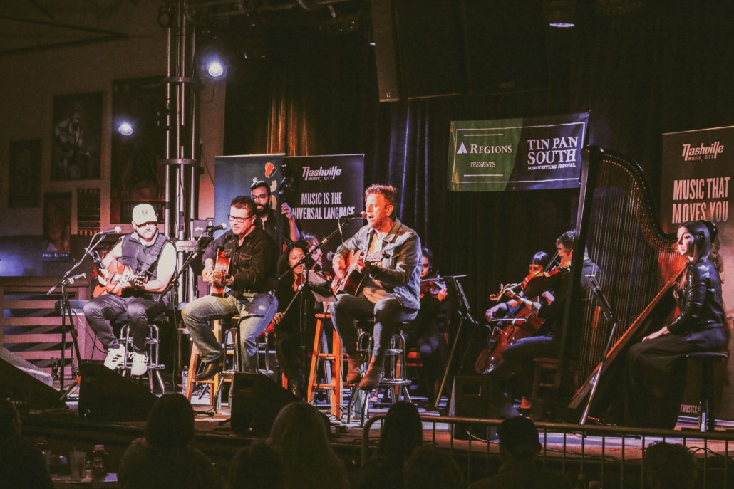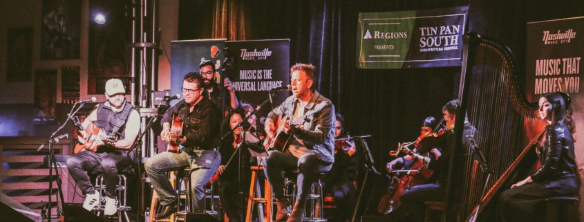 Pictured (L-R): Chris DeStefano, Lee Thomas Miller, and Wendell Mobley performing in Songs Meet Symphony (stage sponsored by Visit Music City) at the late 3rd & Lindsley show. Photo: Tin Pan South/Sydney Zuyus