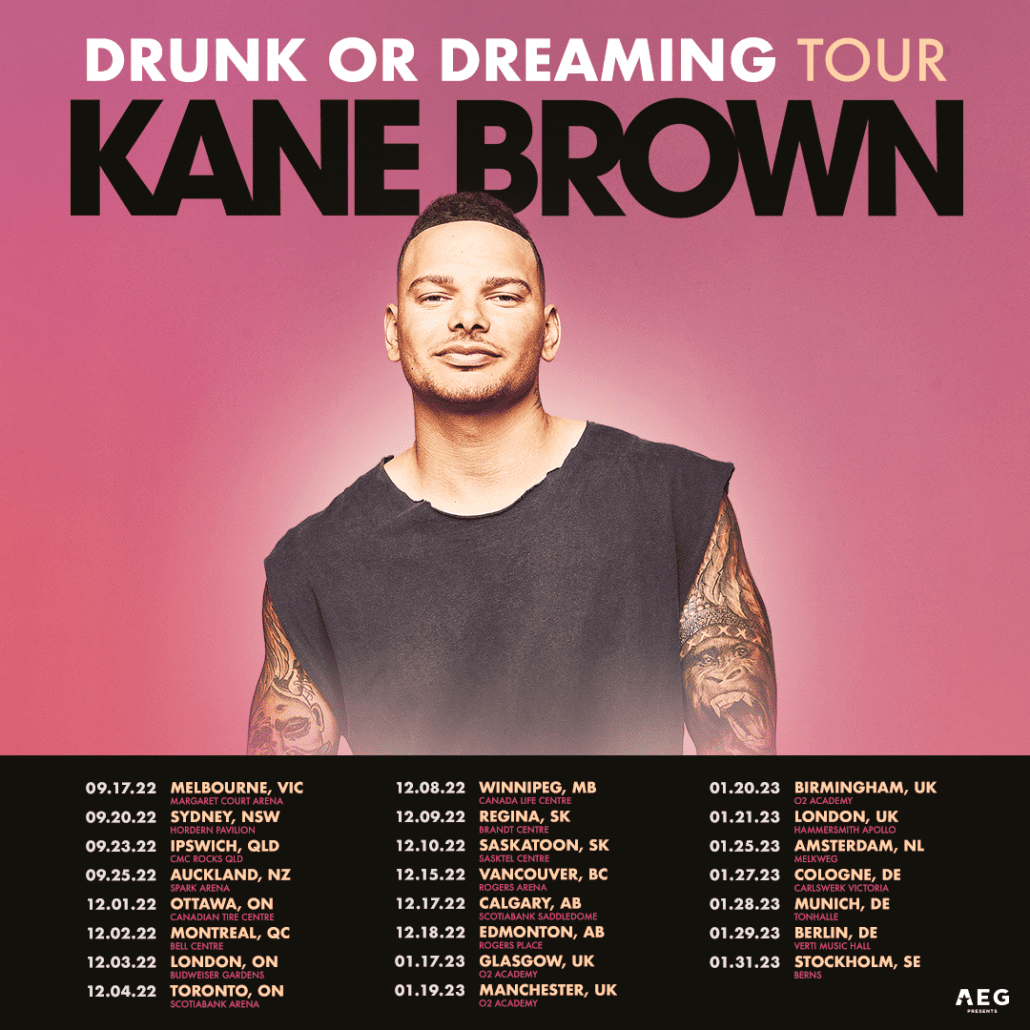 Kane Brown has announced dates for his upcoming international fall trek, “The Drunk or Dreaming Tour,” kicking off Sept. 17 in Melbourne, Australia.