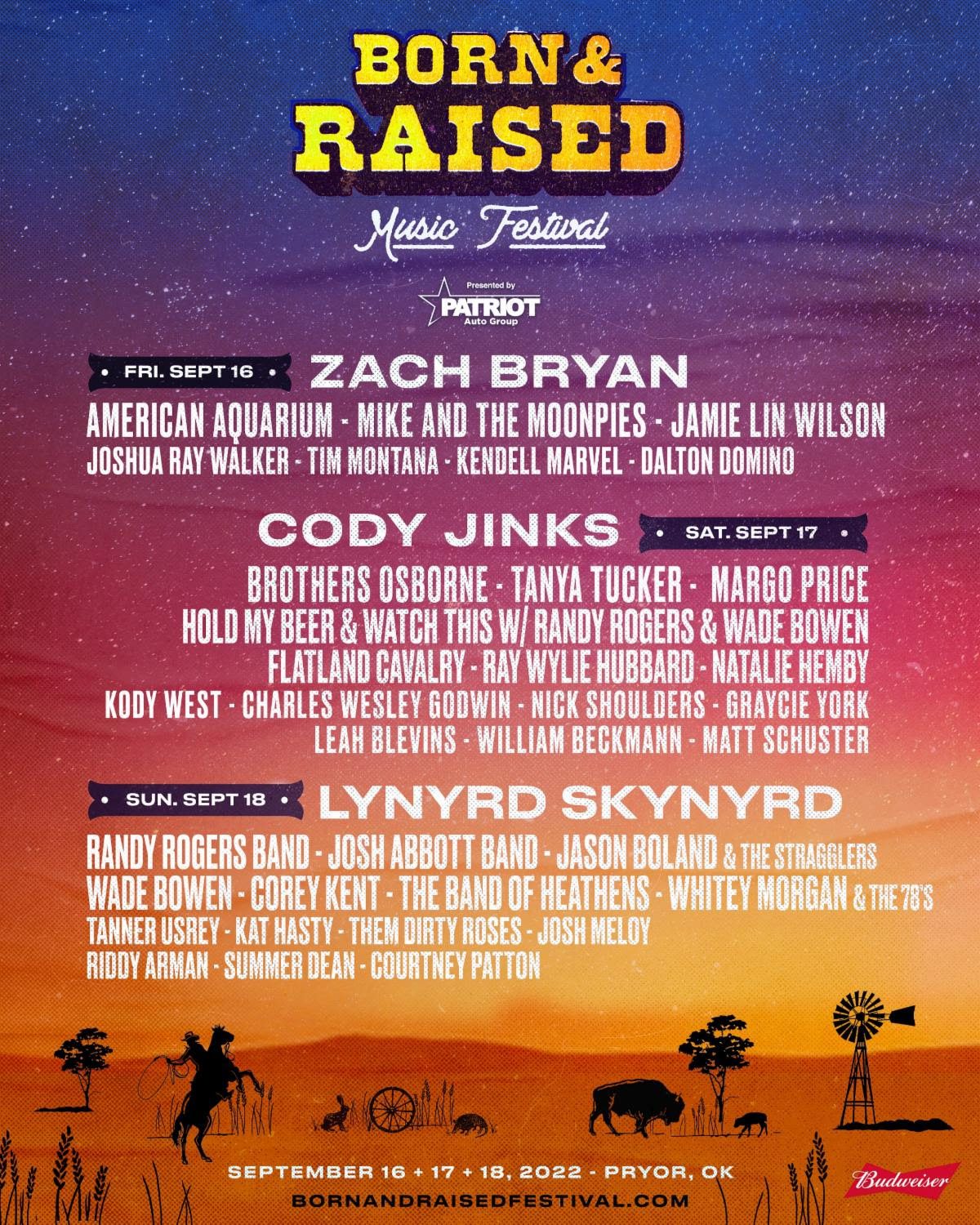 Produced by AEG Presents and Pryor Creek Music Festivals, Born & Raised Music Festival debuted in 2021 with performances from ZZ Top, Cody Jinks, Blackberry Smoke, Zach Bryan, Parker McCollum, Jack Ingram, Jason Boland and The Stragglers, Nikki Lane and more.