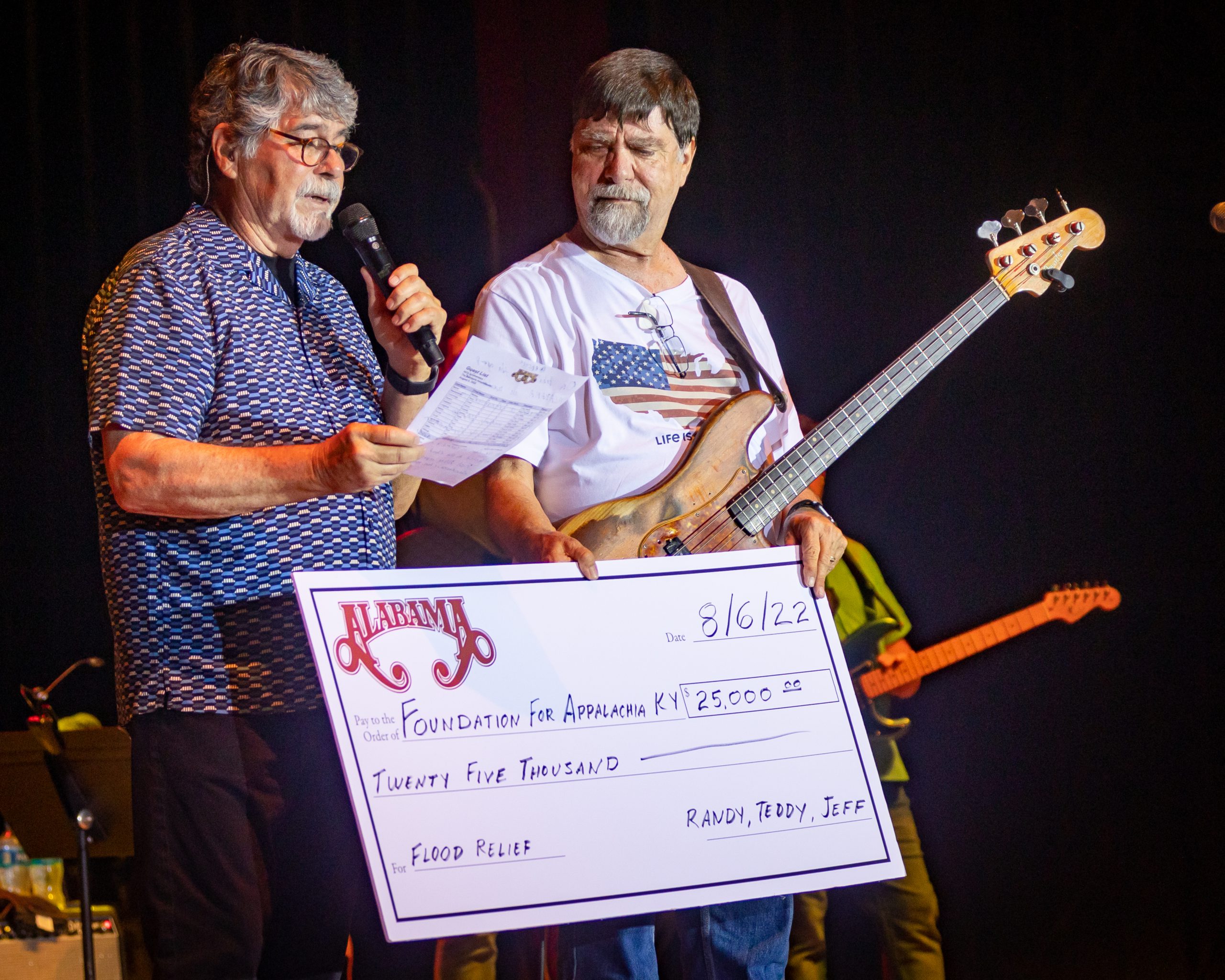 Before a packed crowd at the Barnyard Venue, the group’s founding members Randy Owen and Teddy Gentry presented a check to The Foundation for Appalachian Kentucky, a non-profit organization providing financial help to eastern Kentucky families, farms and businesses that are suffering as result of the catastrophic weather event.