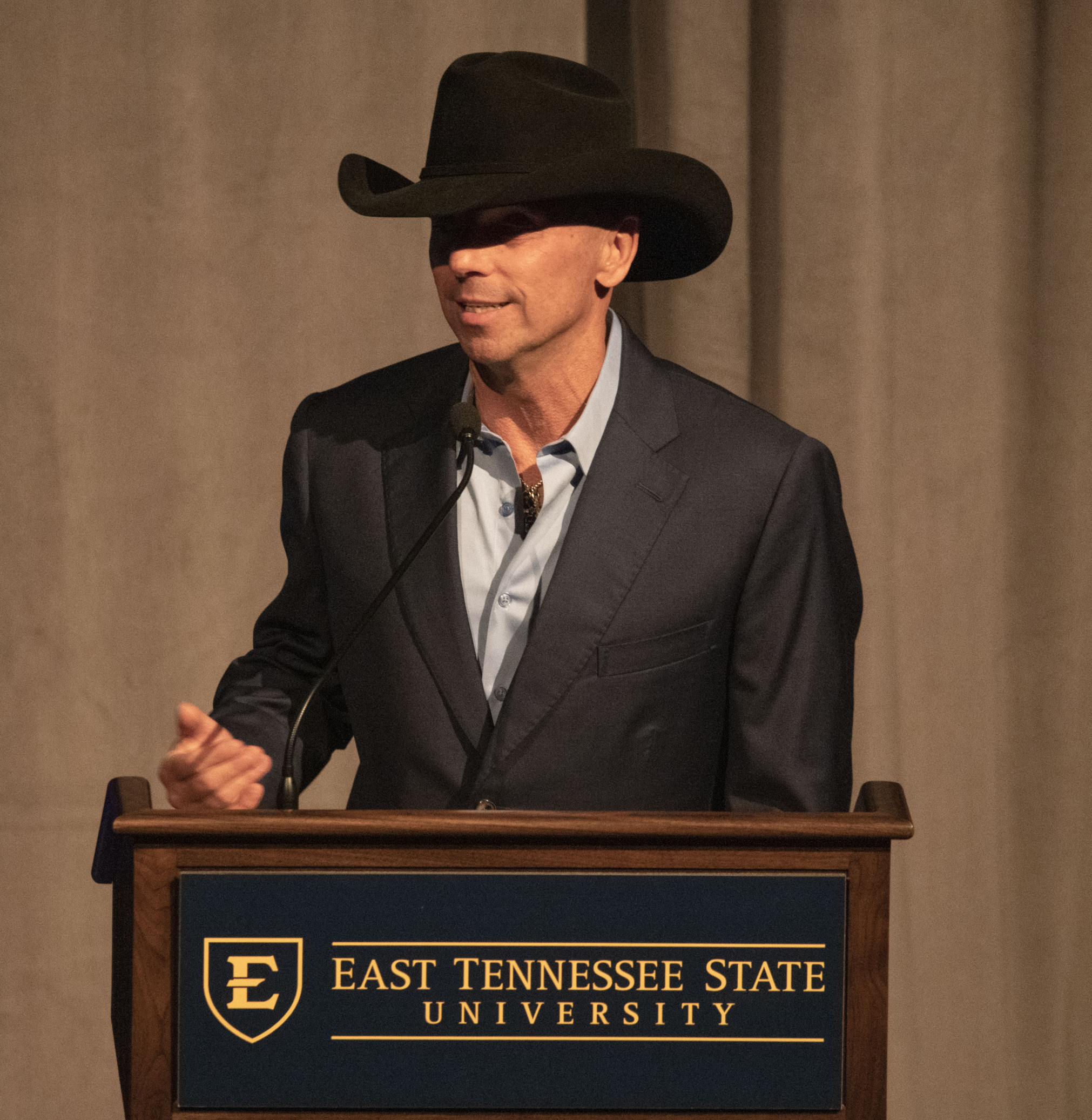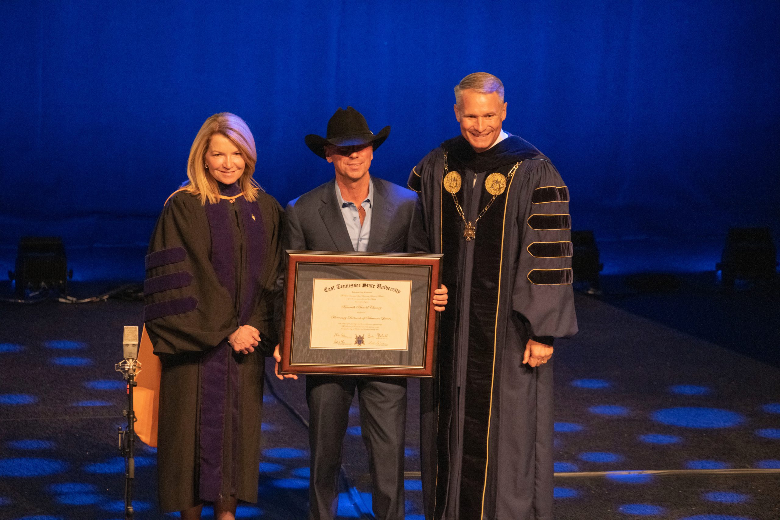 “He is a paradigm-shifting artist who helped define country music in the 21st century, selling out stadiums across the world… He is an inspiration, reminding the world—through his art and the example he sets—to live life with joy, humor, passion, and soul,” shares Noland. “Here at ETSU, we have issued a challenge to our faculty, staff and students to ‘go beyond.’ Mr. Chesney, soon to be Dr. Chesney, you exemplify that ideal. You have gone beyond genres, unifying people through your art and your work. You have gone beyond borders, sharing your amazing talent all over the world. And you have gone beyond yourself, using your voice to uplift others and give back to communities.”