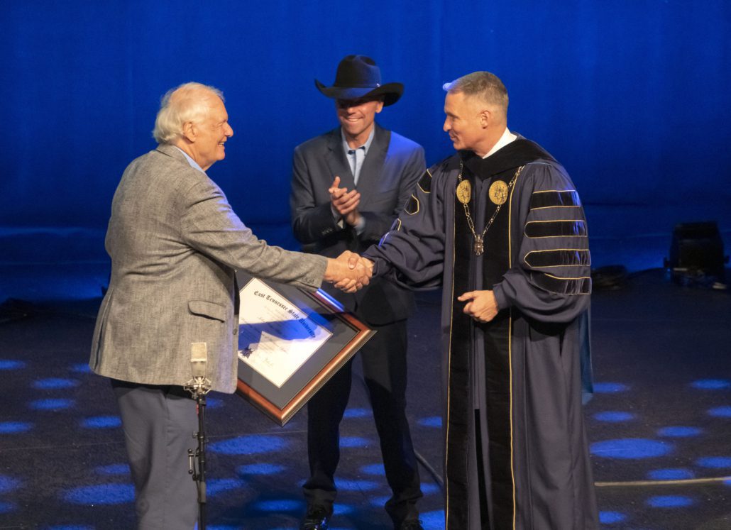 Kenny Chesney joins ETSU President Brian Noland (R) to honor Dr. Jack Tottle (L). Photo: Courtesy of ETSU