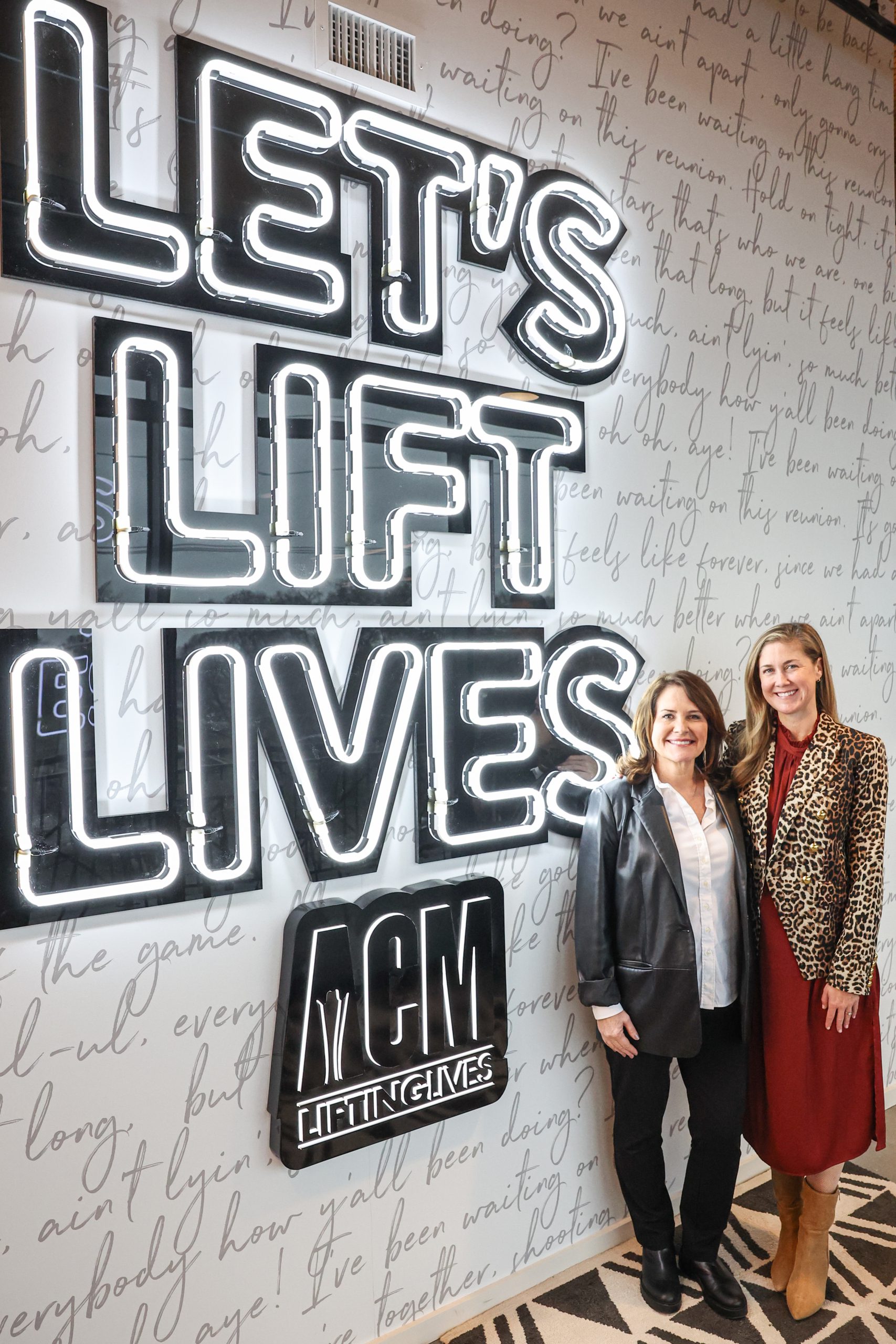 The new office also serves as the Nashville headquarters of ACM Lifting Lives, the philanthropic partner of the Academy of Country Music. Their work is celebrated in the space with a prominent wall featuring the ACM Lifting Lives rallying cry, “Let’s Lift Lives,” spelled out in bright neon and set against a custom wallpaper featuring the lyrics to an original song written this summer at ACM Lifting Lives Music Camp.