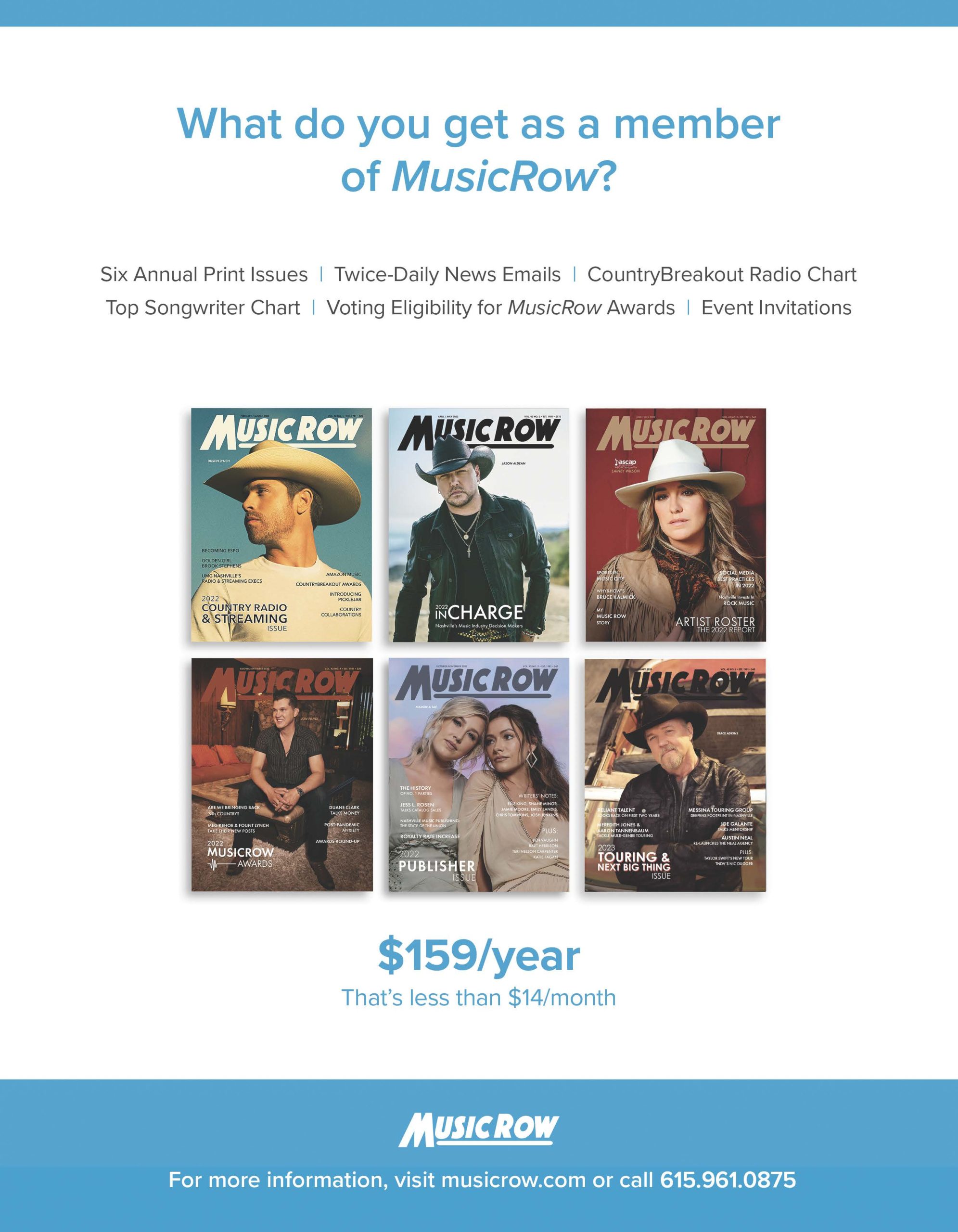 The MusicRow subscription includes six annual print issues, twice-daily emails, breaking news alerts, the CountryBreakout Radio Chart, Top Songwriter Chart, voting eligibility for the annual MusicRow Awards, and more. Among the six annual print issues, MusicRow delivers the Country Radio & Streaming issue, InCharge, Artist Roster, Publisher Issue, MusicRow Awards Issue, and the Touring/Next Big Thing (N.B.T.) Issue.