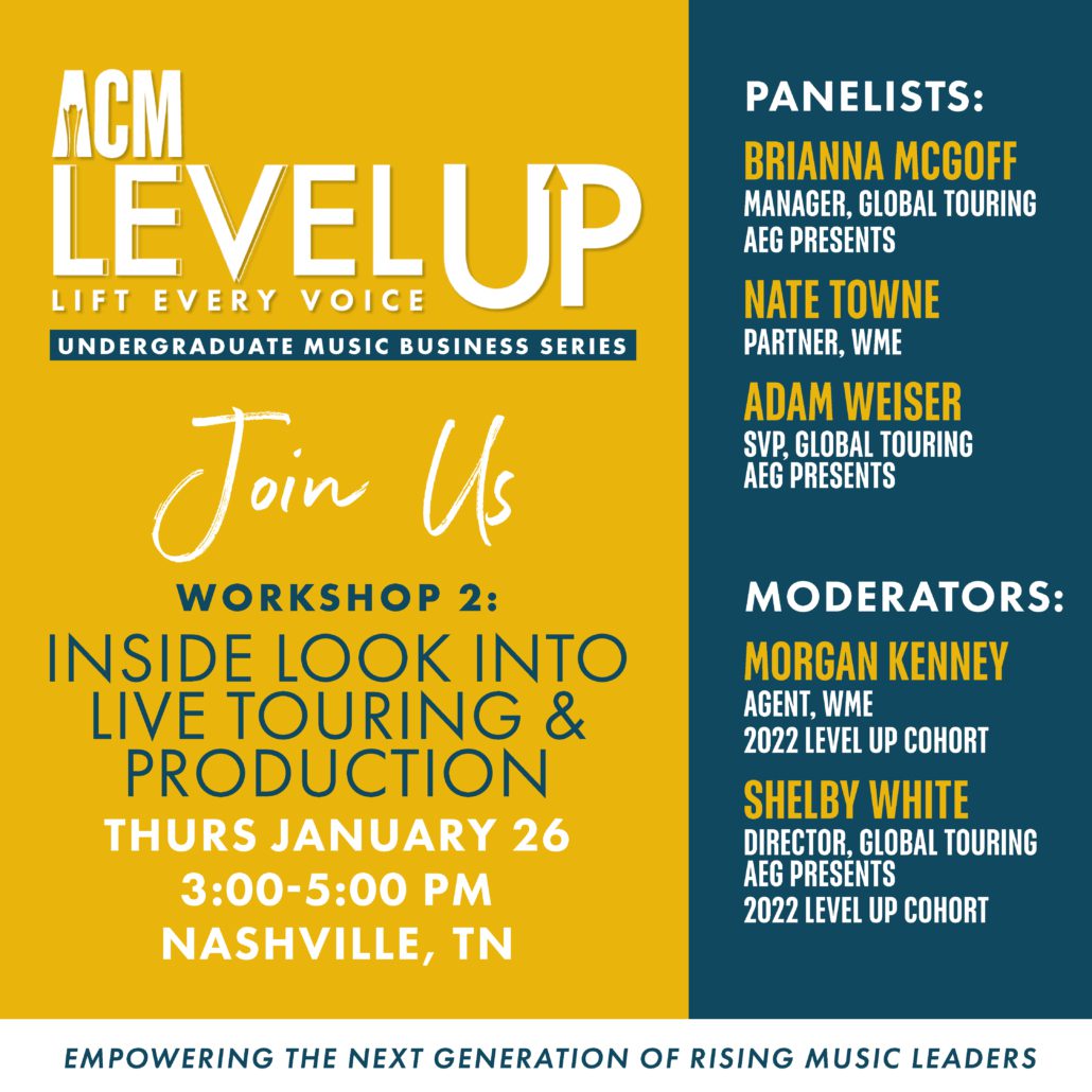 The Academy of Country Music’s LEVel Up: Lift Every Voice program has announced the second workshop of their undergraduate student series. An Inside Look into Live Touring and Production will take place on Thursday, Jan. 26 from 3 p.m. – 5 p.m.
