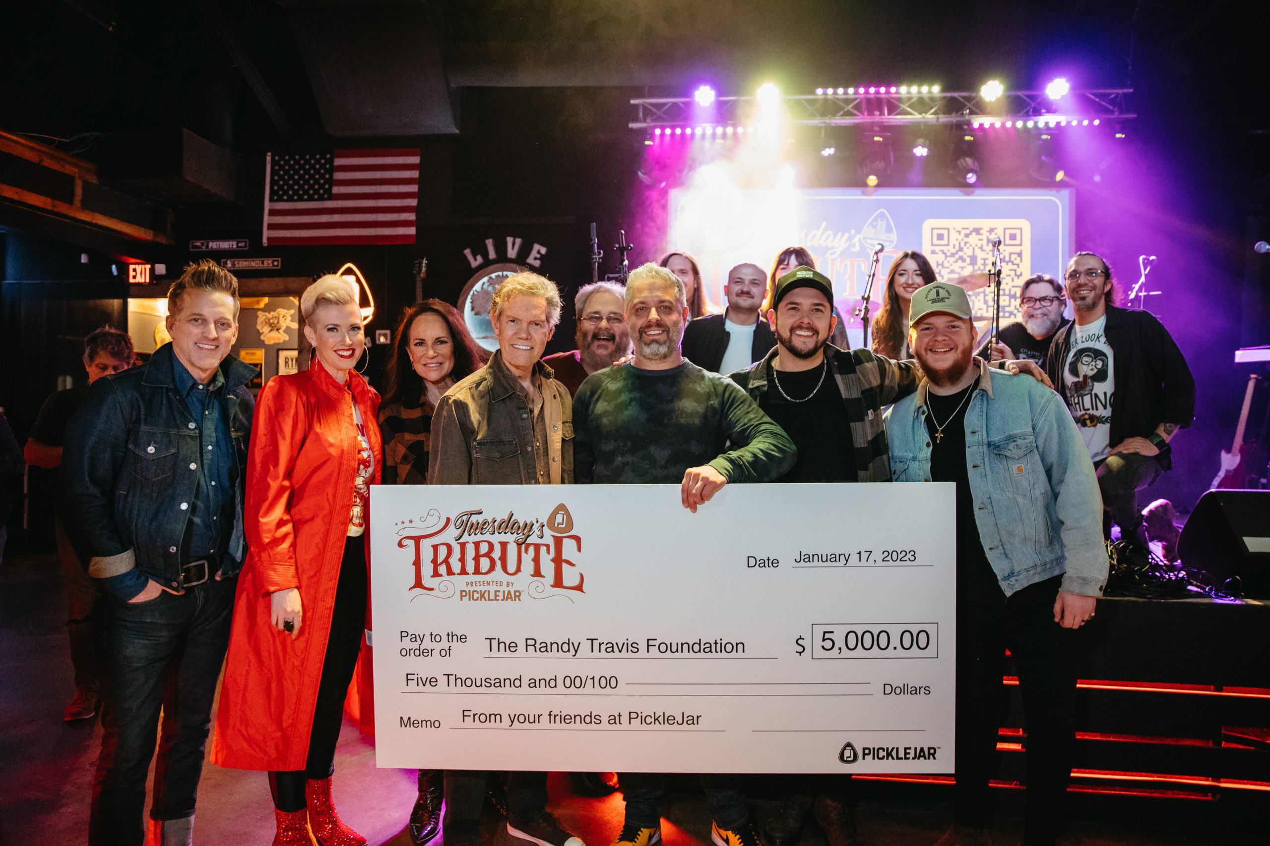 Following this week’s Tuesday Tribute, which celebrated Country Music Hall of Famer Randy Travis, PickleJar presented the Randy Travis Foundation with a $5,000 donation. The evening featured songs from Thompson Square, Shawna Thompson, Timmy Brown, Dave’s Highway and Landon Wall at Live Oak.