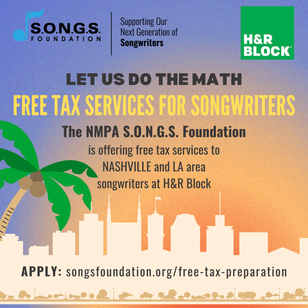 The NMPA S.O.N.G.S. Foundation (Supporting Our Next Generation of Songwriters) has announced it will continue its partnership with H&R Block to provide free tax prep services to songwriters in L.A. and Nashville.