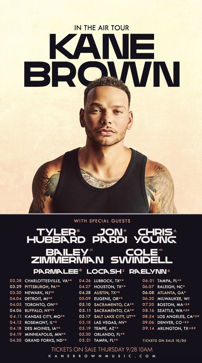 Kane Brown has announced details for his upcoming 2024 “In The Air Tour,” kicking off in March. Artists supporting him on various dates include Tyler Hubbard, Jon Pardi, Chris Young, Bailey Zimmerman, Cole Swindell, Parmalee, LoCash and RaeLynn.