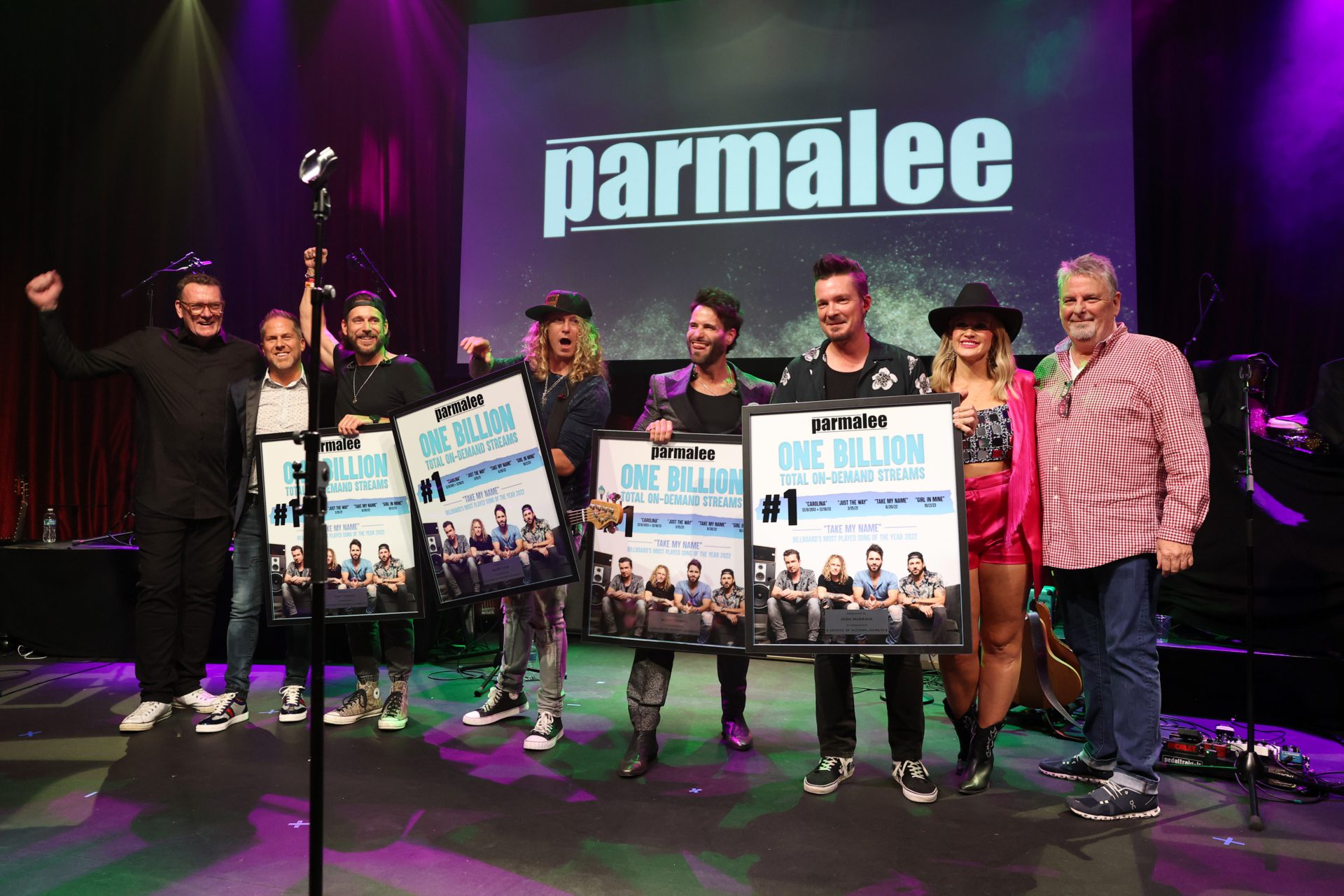 Parmalee was recognized during the festivities for several career milestones including 1 Billion On-Demand Streams, four No. 1 Singles (“Carolina,” “Just The Way,” “Take My Name” and “Girl In Mine”) and for having Billboard‘s 2022 Most Played Song of the Year with “Take My Name.” Wilson was also honored with a double Platinum plaque for her smash “Heart Like a Truck,” and BMG presented a check to Jelly Roll in the amount of $100,000 for his Impact Youth Outreach foundation.