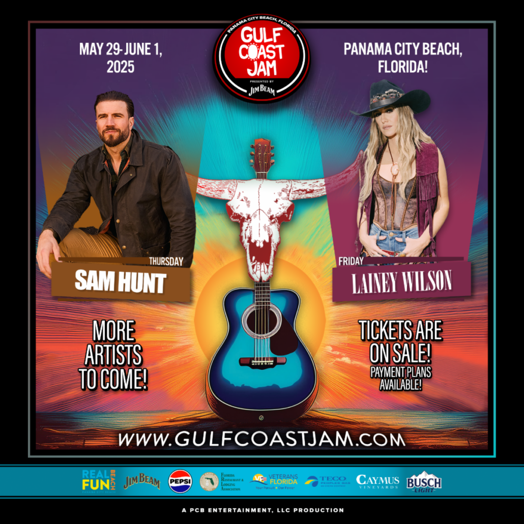 The upcoming Gulf Coast Jam presented by Jim Beam is set to take place in Panama City Beach May 30 through June 1, 2025, with additional headliners to be announced in the coming weeks. Tickets are available now at www.gulfcoastjam.com.