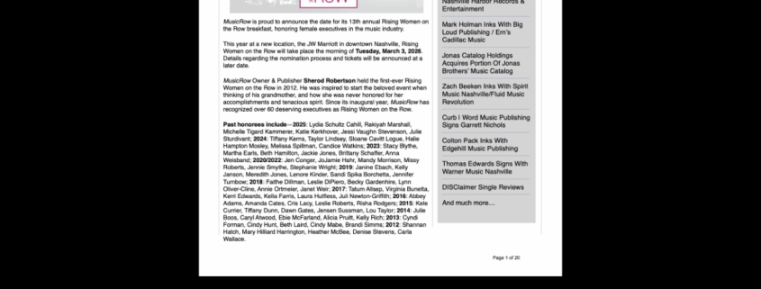 MusicRow announced that its 13th annual Rising Women on the Row breakfast will take place on Tuesday, March 3, 2026. This year, the celebration of female executives shaping the music business will be held at a new location, the JW Marriott in downtown Nashville.