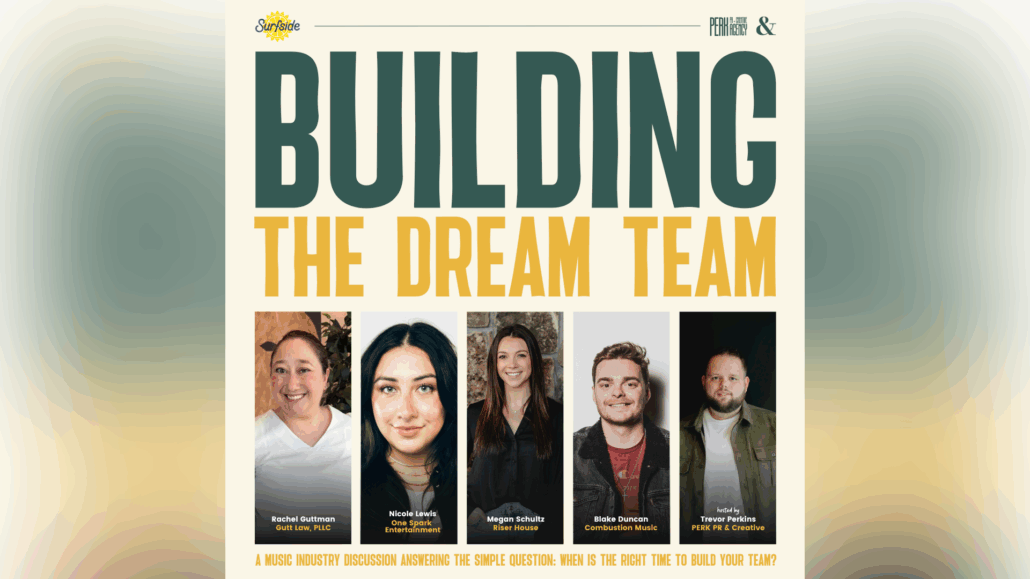“Building the Dream Team” will feature a panel of industry members including Rachel Guttman (Gutt Law, PLLC); Nicole Lewis (One Spark Entertainment); Megan Schultz (Riser House); and Blake Duncan (Combustion Music), and will be hosted by Trevor Perkins, founder of PERK PR + Creative Agency.