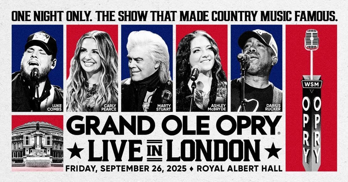 “Grand Ole Opry: Live From London” is set for Sept. 26 at London’s Royal Albert Hall. Special UK guest artists Mumford & Sons and Breabach are slated to appear alongside Opry members Luke Combs, Ashley McBryde, Carly Pearce, Darius Rucker and Marty Stuart. The show will be co-hosted by BBC Radio 2 presenter Vernon Kay and WSM Radio host Kelly Sutton.