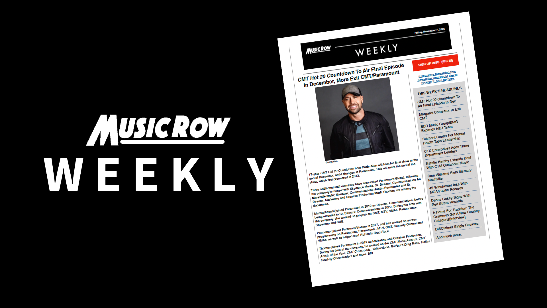 After 17 years as host of CMT’s Hot 20 Countdown, Cody Alan will sign off for the final time at the end of December. His departure also the conclusion of the show itself, which first premiered in 2013. The change comes amid broader shifts at Paramount Global, following its merger with Skydance Media. As part of the restructuring, three additional employees—Ali Marszalkowski (Sr. Director, Communications), Justin Permenter (Manager, Communications), and Mark Thomas (Sr. Director, Marketing and Creative Production)—are also exiting the company. Longtime CMT Senior Vice President of Production, Music & Events, Margaret Comeaux, will depart at the end of the year, closing out a 25-year tenure with the organization.