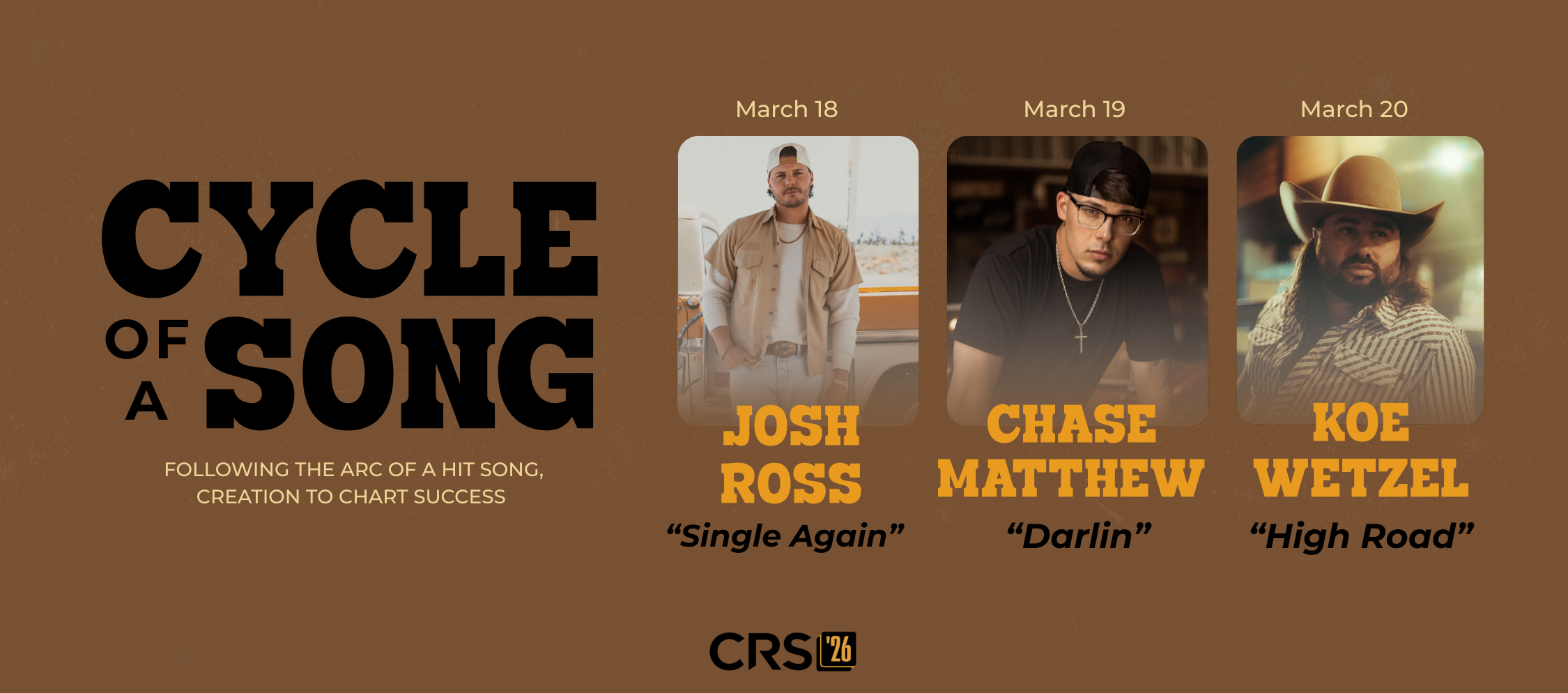 The “Cycle of A Song” series provides a behind-the-scenes exploration of the journey a song takes from inception to chart success. This year’s series will feature Josh Ross’ “Single Again,” Chase Matthew’s “Darlin’,” and Koe Wetzel’s “High Road.” Additional details including panel participants and more will be announced at a later date.