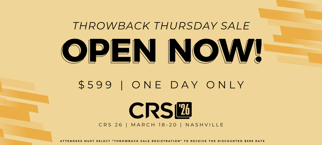 CRS will offer their early bird rate of $599 for one day only, tomorrow (Jan. 8). This will be the last chance to pay the lowest rate possible. During the sale, both the standard and Throwback Sale registration options will appear at checkout. Attendees must select “Throwback Sale Registration” to receive the discounted rate. On Jan. 9, CRS 2026 registration will return to the regular rate of $698.