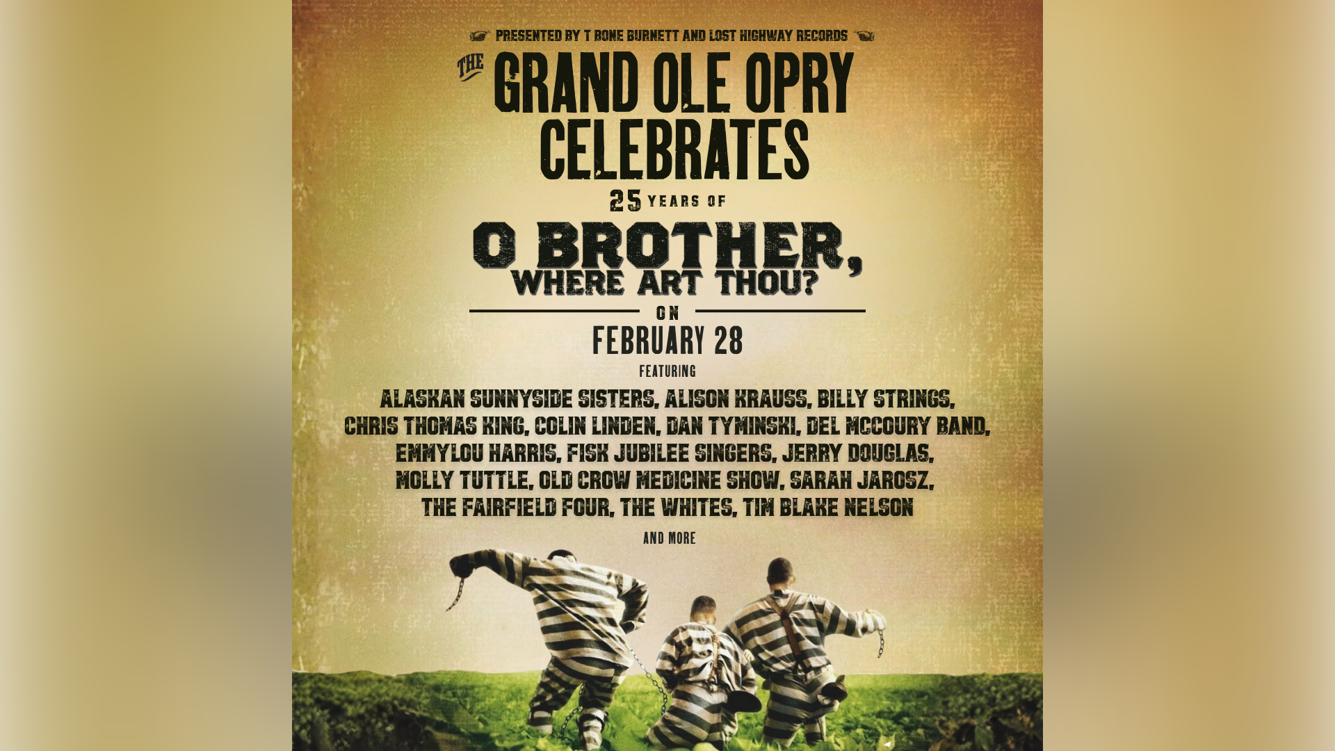The special Opry show will feature artists from the original soundtrack and more, and will also include Alaskan Sunnyside Sisters, Alison Krauss, Billy Strings, Chris Thomas King, Colin Linden, Fisk Jubilee Singers, Jerry Douglas, Molly Tuttle, Sarah Jarosz, The Fairfield Four, The Whites and Tim Blake Nelson.