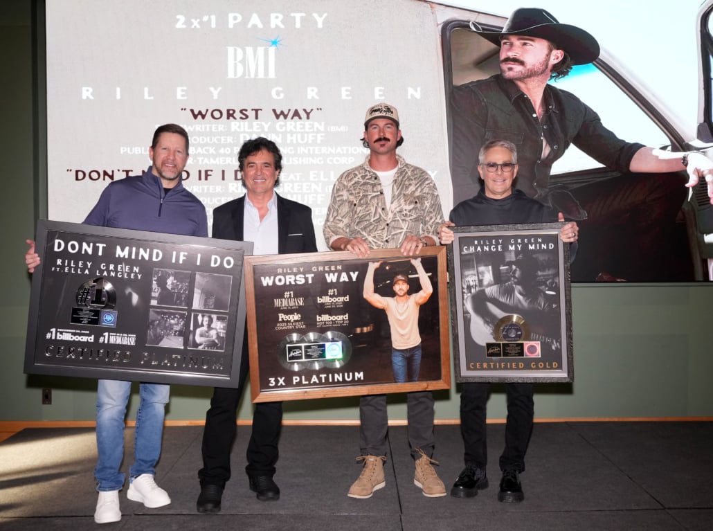 BMLG’s Scott Borchetta and NHRE’s Jimmy Harnen and Ryan Dokke presented BMI’s Riley Green with No. 1 plaques for “Don’t Mind If I Do” and “Worst Way,” along with a Gold plaque for “Change My Mind,” his current single and fastest-rising track at country radio to date. They also announced that “Worst Way” is now certified 3X Platinum by the RIAA. ; Photo Credit: Larry McCormack for BMI