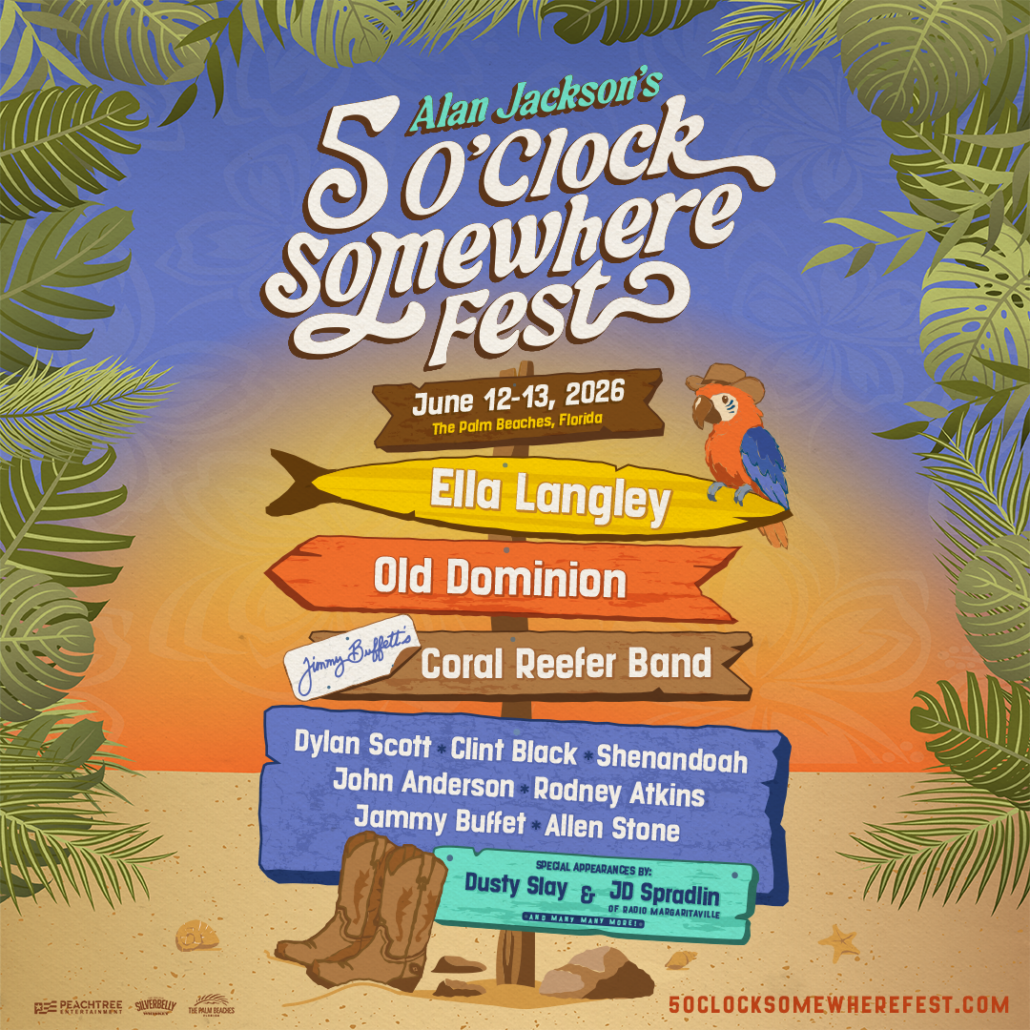 Alan Jackson‘s first-ever Five O’Clock Somewhere Fest!, a multi-day festival experience blending music, coastal culture, and elevated hospitality will take place June 12-13 at The Palm Beaches Waterfront Commons in West Palm Beach, Florida.