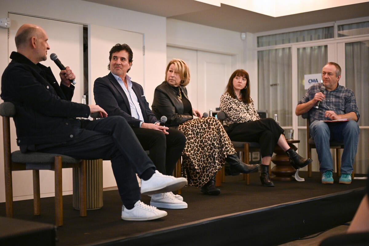 Pictured (L-R): Jim King, Scott Borchetta, Sarah Trahern, Rachel Davies and Mark Sutherland speak during the 2026 CMA International Summit at Soho Works on March 11, 2026 in London, England. Photo: Kate Green/Getty Images for CMA