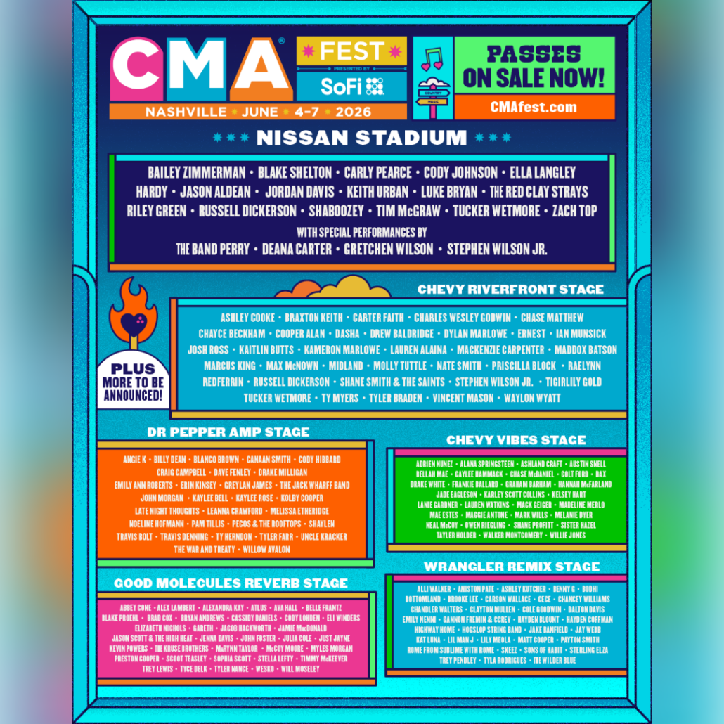 CMA Fest has revealed its 2026 outdoor stages lineup, which includes the Chevy Riverfront Stage, Dr. Pepper Amp Stage, Chevy Vibes Stage, Good Molecules Reverb Stage, and the new Wrangler Remix Stage.