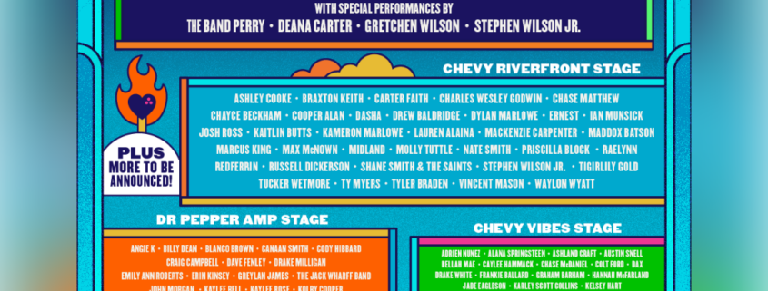 Performers on the Chevy Riverfront Stage include Ashley Cooke, Braxton Keith, Carter Faith, Charles Wesley Godwin, Chase Matthew, Chayce Beckham, Cooper Alan, Dasha, Drew Baldridge, Dylan Marlowe, Ernest, Ian Munsick, Josh Ross, Kaitlin Butts, Kameron Marlowe, Lauren Alaina, Mackenzie Carpenter, Maddox Batson, Marcus King, Max McNown, Midland, Molly Tuttle, Nate Smith, Priscilla Block, RaeLynn, Redferrin, Russell Dickerson, Shane Smith & The Saints, Stephen Wilson Jr., Tigirlily Gold, Tucker Wetmore, Ty Myers, Tyler Braden, Vincent Mason and Waylon Wyatt.