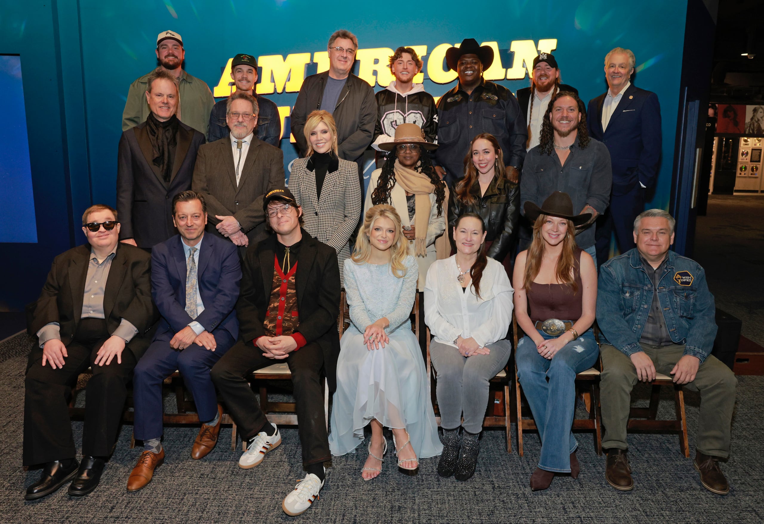 Pictured (L-R, back row): Charlie Muncaster and Gary Stanton of Muscadine Bloodline; Vince Gill; Bailey Zimmerman; BigXthaPlug; Charlie Handsome and Country Music Hall of Fame and Museum CEO Kyle Young. (L-R, middle row): Barry Bales; Jerry Douglas and Alison Krauss of Alison Krauss and Union Station; Shorlette Ammons representing Farm Aid; Sarah Jarosz of I’m With Her and Brandon Lake. (L-R, front row): Michael Cleveland and Jason Carter; Stephen Wilson Jr.; Carter Faith; Georgette Jones representing Tammy Wynette; Kaitlin Butts and Dan Rogers of the Grand Ole Opry. Photo: Jason Kempin/Getty Images for the Country Music Hall of Fame and Museum