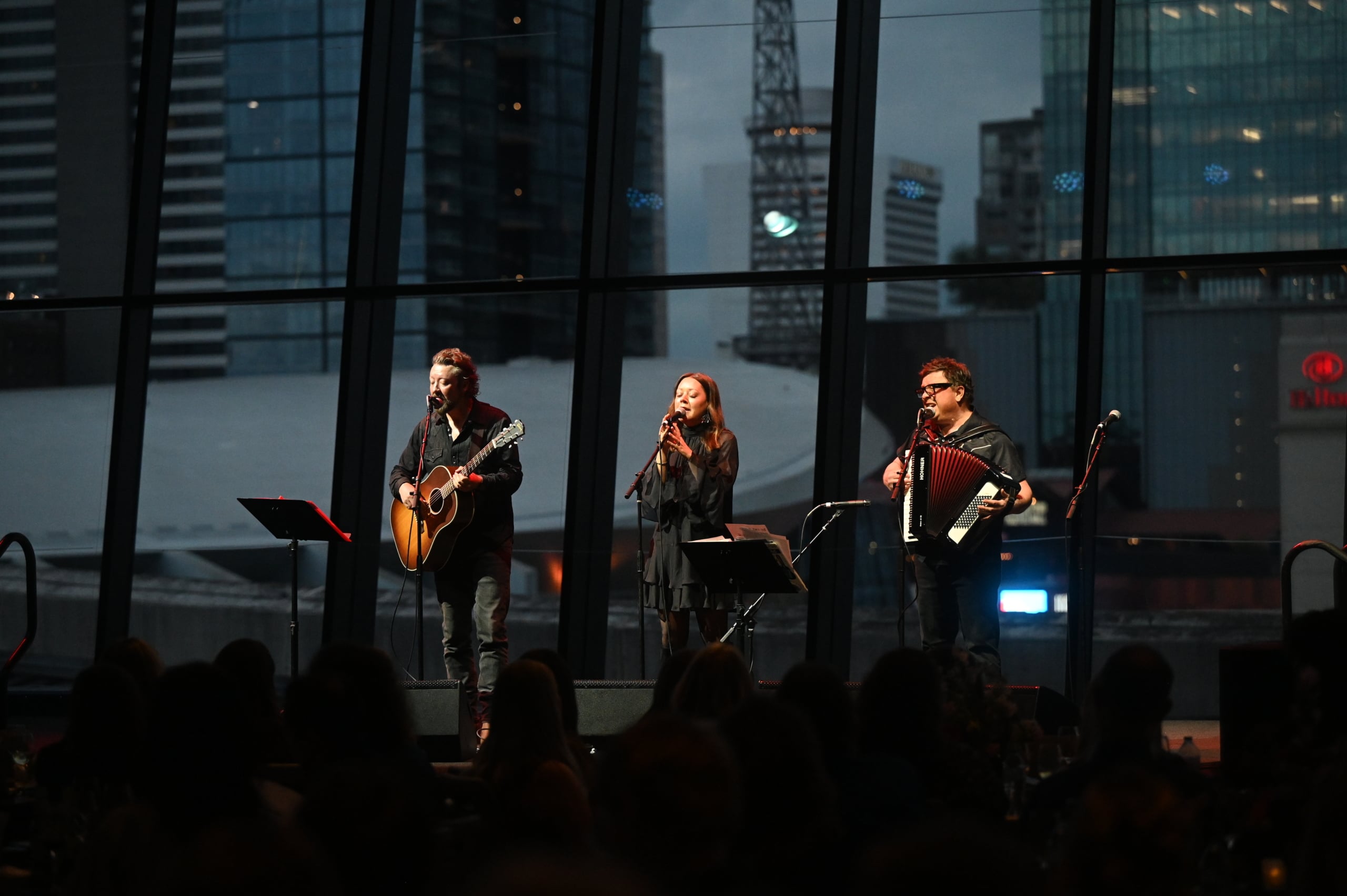Hillary Lindsey, Cary Barlow, and Gordie Sampson perform the In Memoriam tribute at the 16th Annual CMA Triple Play Awards. Photo: Alyssa Barker/CMA