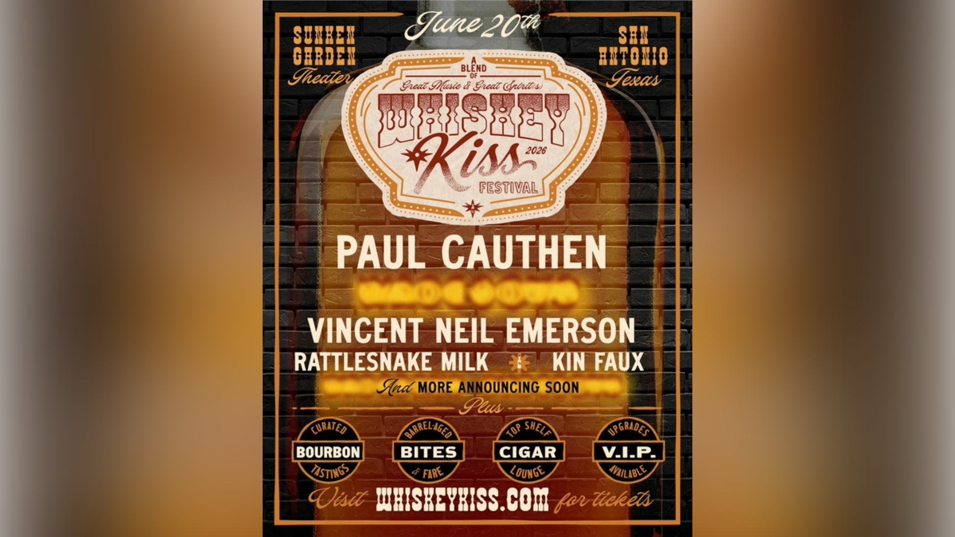 The debut event lineup will feature Paul Cauthen, Vincent Neil Emerson, Rattlesnake Milk, Kin Faux and more, delivering a full day of storytelling, gritty guitars and sing-along anthems. Throughout the festival grounds, themed bars will showcase inventive bourbon-inspired cocktails created by San Antonio mixologists, alongside full bars serving beer, wine, and classic favorites. Another standout element of Whiskey Kiss will be the Cigar & Bourbon Lounge Experience, a premium lounge offering curated top-tier bourbon and hand-selected cigar pairings.