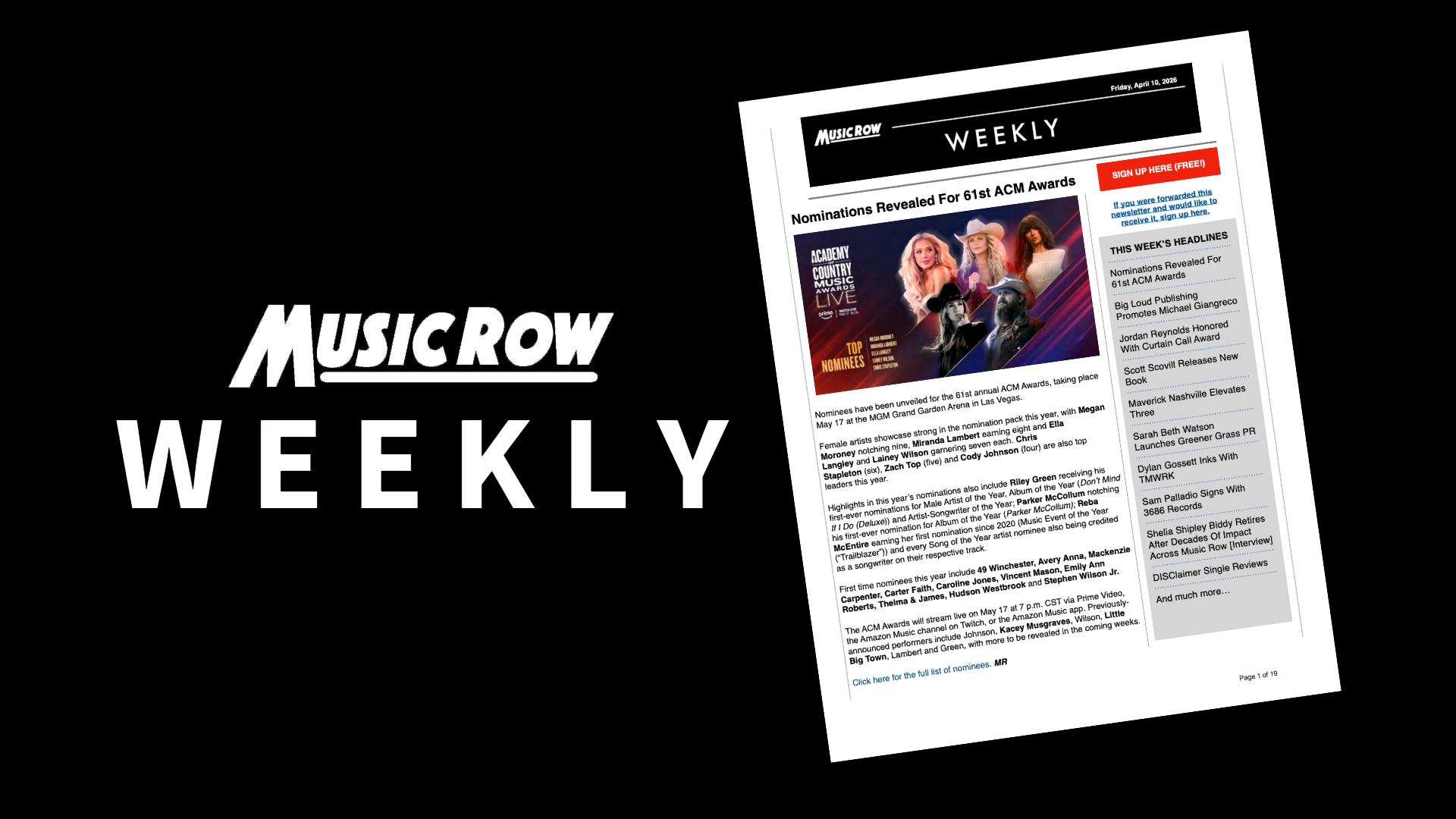 /by Madison HahnenThe latest edition of The MusicRow Weekly captures a dynamic moment across the country music industry, with major award nominations, career milestones and new ventures shaping the week’s headlines. Click here to see the full edition.