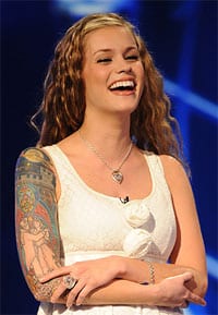 Each season needs at least one all-American blonde and Megan Joy does an admirable job filling out the top 11 in that respect. Fortunately, she can also sing—with guts. Undaunted by a fight with the flu she bravely took the stage to sing “Walking After Midnight.” Her low cut halter gown showed off her natural attributes as well as the four color tattoo which completely covers her right arm from shoulder to elbow.